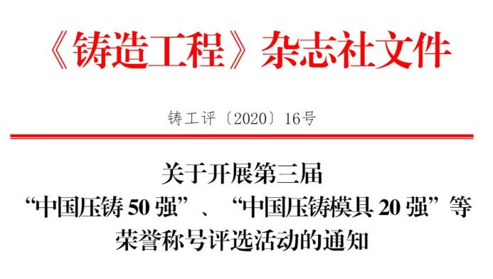 为展示压铸行业近几年快速发展所取得的成绩,提高优秀压铸及压铸模具企业品牌影响力,“树标杆、引路径”推动压铸行业健康发展,现正式启动第三届“中国压铸件生产企业综合实力50强(简称中国压铸50强)”、“中国压铸模具生产企业综合实力20强(简称中国压铸模具20强)”及“中国铸造行业压铸件生产企业和中国铸造行业压铸模具生产企业成长之星”评选活动。请年产值超过1.5亿元人民币的压铸件生产企业和年产值超过5000万元人民币的压铸模具生产企业踊跃报名参加。
