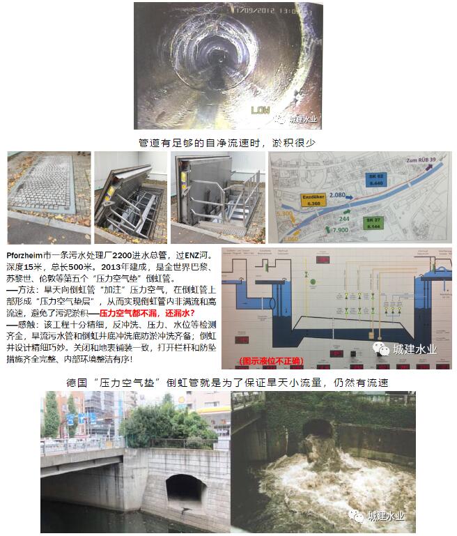 排水管道设计一定是从末端向起端设计的,污水、雨水管道要与下游道路污水、雨水管相接、与泵站相接,雨水管甚至要直接接入水体。所以一定要搞清楚相接点基本设计要素,管径、坡度、管底高程,更要对下游系统可否接入所设计管道的设计水量进行必要的验算和复核,可不能够把管子“一捅了之”。能否把大学排水工程课本里的“管顶平接”、“水面平接”应用到实际情景中,就是基本功的体现。雨水直接排入水体,就一定要说清楚所排入的水体基本情况,如常水位、多年平均高水位、最高水位等。要提醒的是:保证“不淤流速”是排水管道设计的灵魂,一定要慎用“最小坡度”,特别是在按照远期流量设计时,否则就要考虑冲淤措施。德国“压力空气垫”的倒虹管就是案例。自流雨水排水口一定要在常水位以上,一定要避免淹没出流,否则设计的就不是满管重力流,设计方法就错了。
