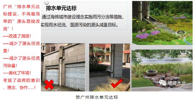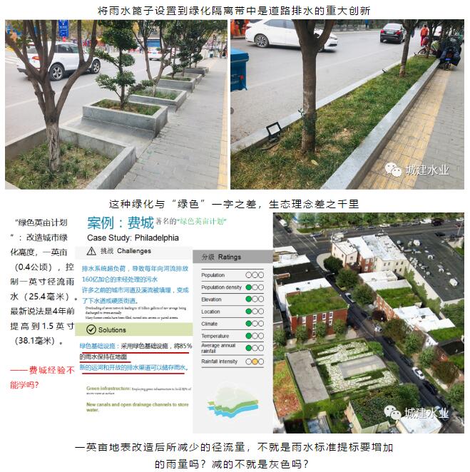 道路排水管道要为将服务范围内排水对象的污水、雨水有效接入创造条件。自2006年,上海市水务局在推进第三轮环保三年行动计划时,就提出了二级管网(沿道路敷设,服务于道路两侧排水户的排水管道)包括伸出道路红线一米的支管和支管末端检查井,以便于三级管网(街坊、小区、企事业单位内)排水管道的接入。现在看来,无疑是对实现污水全收集是正确和合理的。另外为了应对雨水排水标准提高,有两个做法,一是做“加法”,二是做“减法”。“加法”不单是按照新的标准加大道路雨水管管径,更重要的是要按照新的雨水标准把雨水篦子和连管设置好,要让雨水系统能够做到(雨水口)“嘴巴喝得进”、(连管)“嗓子进得去”、(道路雨水管)“肠子不梗阻”、(雨水排口)“排口排得出”。一定要记住脱离雨水收集口的雨水排水设计是不完整的雨水排水设计。“减法”就是做好LID,利用“海绵措施”把径流量减下来,“减法”实际上也是对“进口”一种创新设计。将道路绿化隔离带、人行道、小区内部、屋顶进行海绵化改造和设计,这就是创建“海绵城市”的具体行动,这就是城市工程海绵化。图中美国费城的“绿色英亩计划”案例就证明,“减法”是雨水排水提标的重要手段。做好“减法”还会收到一个非常好的效果,那就是有效减少了“径流污染”,这是实现城市水体“下雨不黑”的最有效措施。“减法”体现的是“绿、灰”相结合,体现的是“优先考虑更多利用自然力量排水”。广州利用绿色措施实现“排水单元达标”就是对雨污混接改造工作的创造性发展。很多城市雨水排水规划、设计文件为体现海绵城市创建和提标,不谈绿色措施,而简单地将“综合径流系数”调整0.6是不科学、不现实和不负责任的做法。